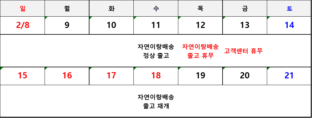 | 제목 | [공지] 2026년 설 연휴 주문/배송 일정 및 고객센터 휴무 안내 | 작성일 | 2026-02-05 |