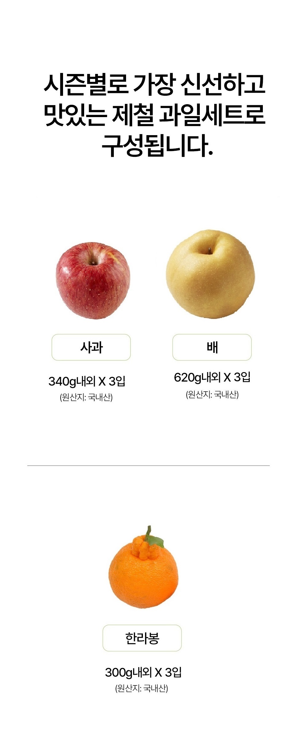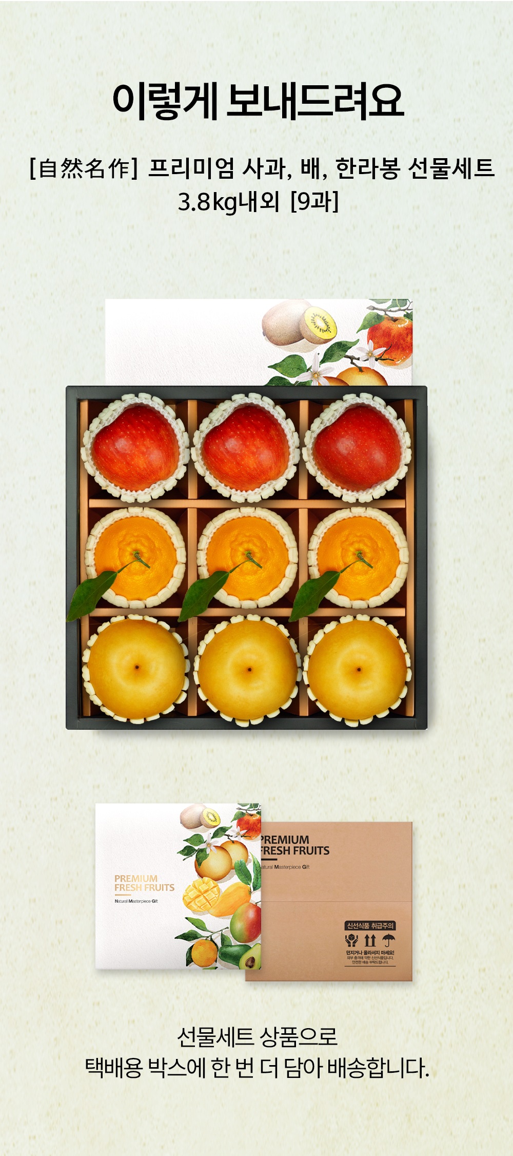 | 판매단위 | 3.8kg내외[9과(사과,배,한라봉 각 3입)] | |