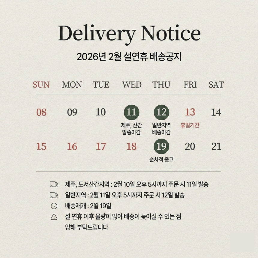 · 공휴일 전날은 출고 불가하며 당일 출고건은 다음날 배송됩니다.