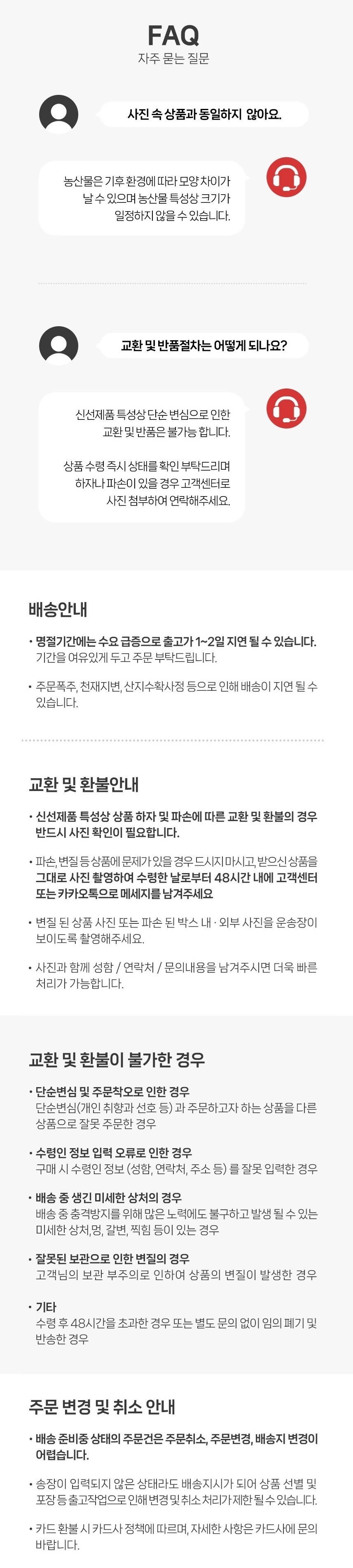 · 주의사항 - 일요일, 법정공휴일은 배송(도착)하지 않습니다. (명절 및 특수시즌 제외) - 배송지 정보와 받으시는 분의 장소 및 연락처가 불분명할 경우에는 배송이 지연될 수 있으며, 그로 인한 상품 변질에 대해서는 자연이랑이 책임지지 않습니다. |
