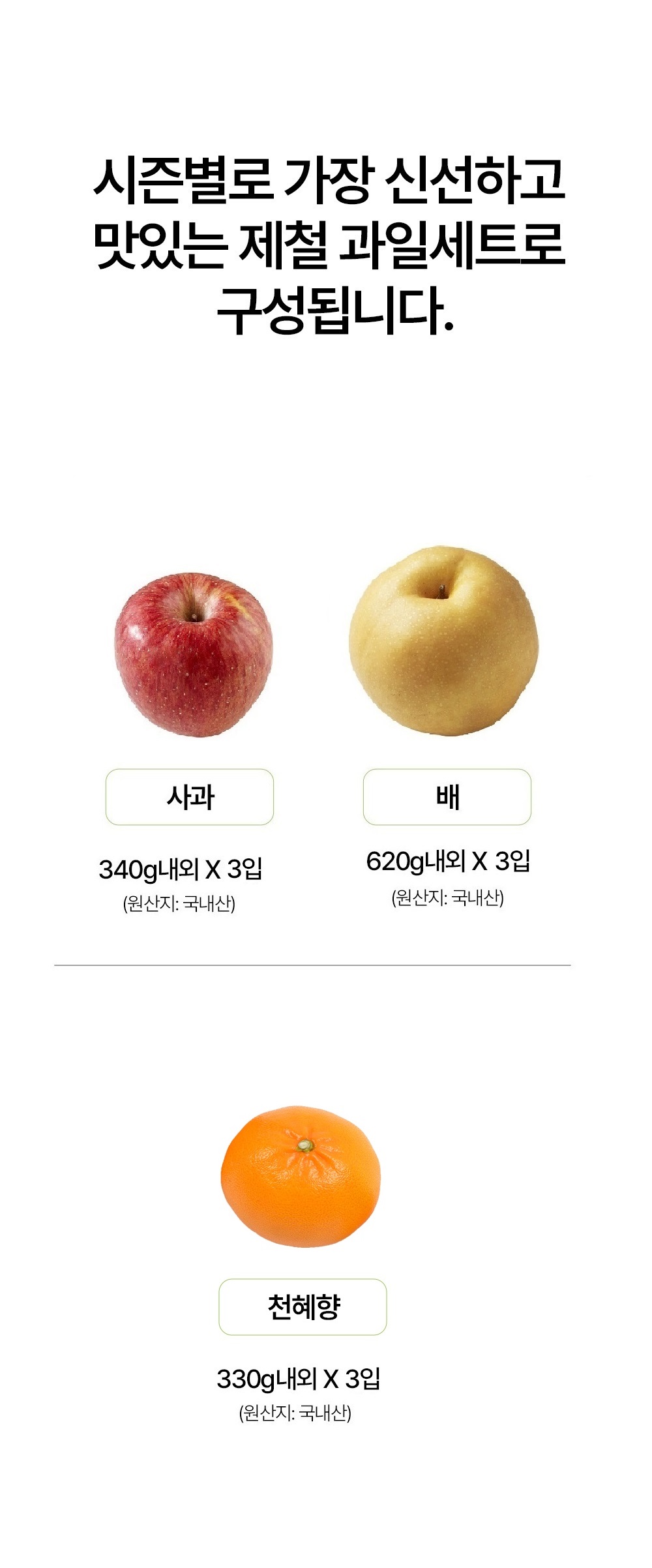 | 판매단위 | 3.9kg내외(사과 3입, 배 3입, 천혜향 3입) |