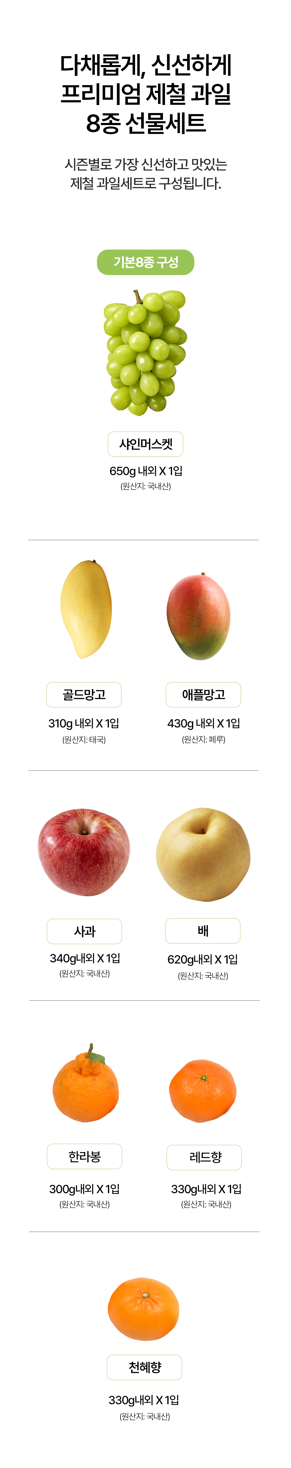 | 판매단위 | 3.3kg내외[샤인머스켓 1입(650g내외), 사과 1입(340g내외), 배 1입(620g내외), 골드망고 1입(310g내외) |