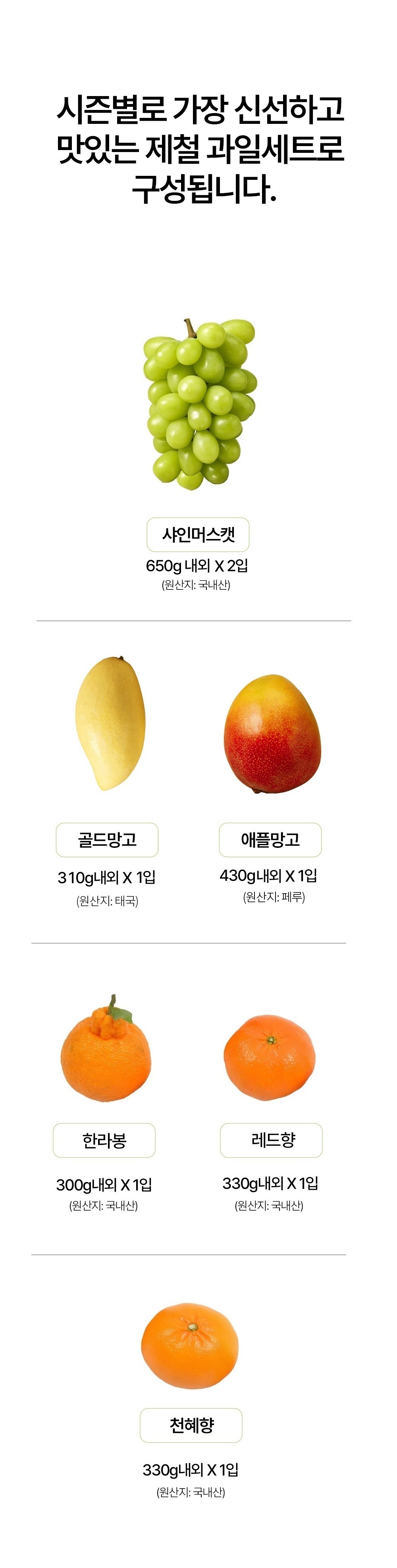 | 판매단위 | 3kg내외[샤인머스켓 2입(650g내외), 골드망고 1입(310g내외), 애플망고 1입(430g내외), 한라봉,레드향,천혜향 |