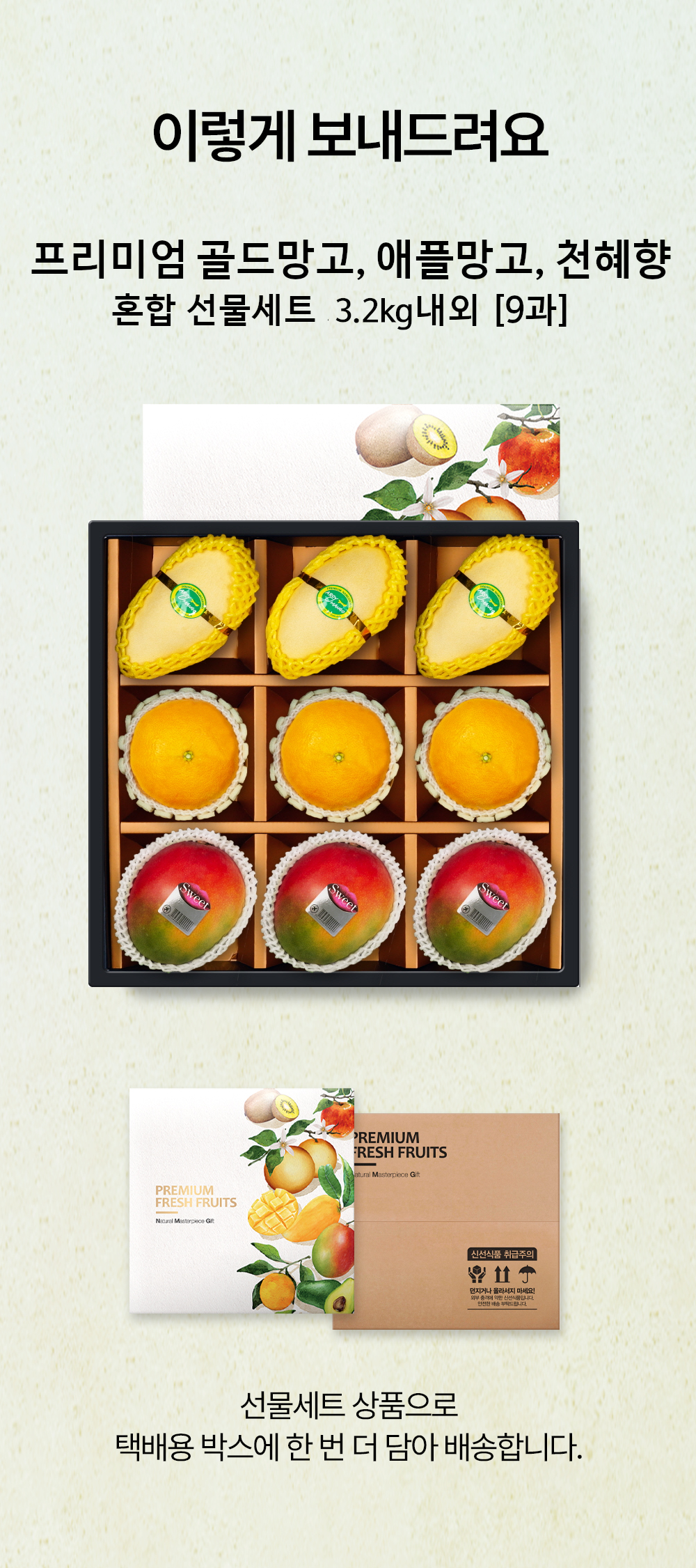 | 판매단위 | 3.2kg내외(골드망고 3입, 애플망고 3입, 천혜향 3입) |