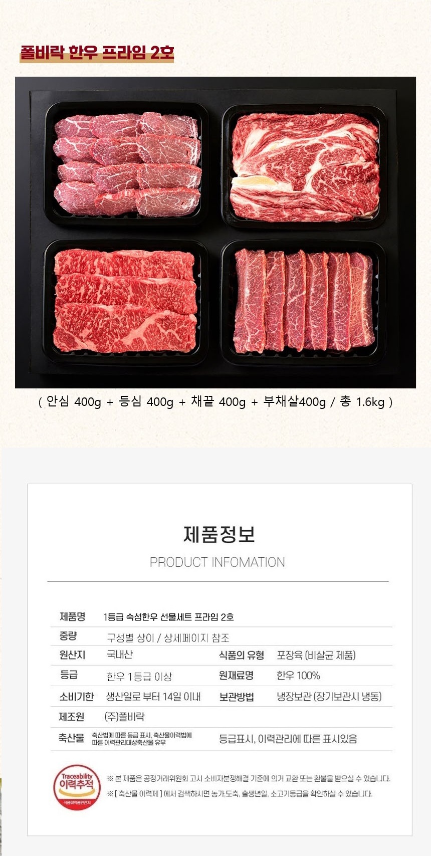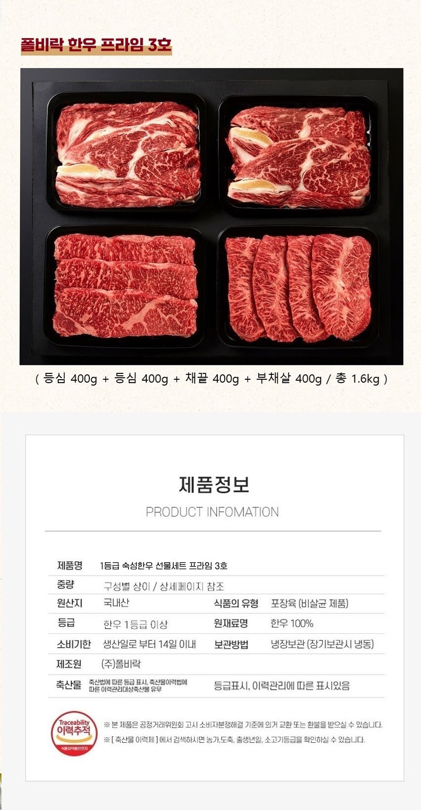 | 판매단위 | 1.2kg내외(등심400g, 채끝400g, 부채살400g) | |