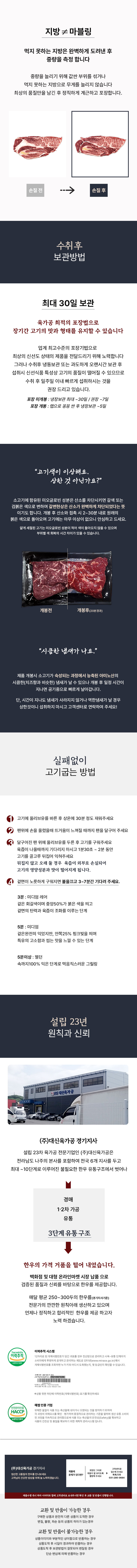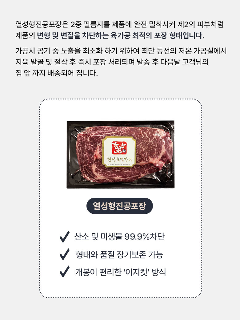진공 스킨 포장으로 보내드리는 상품입니다. 진공 포장 시 고기 숙성과정에서 발생하는 아미노산(가스발생)의 응집에 의해 개봉 시 일시적으로 이취가 발생 할 수 있습니다. 개봉 후 잠시 상온에 두거나, 핏기를 닦아내면 이내 사라집니다. 외부 산소 차단에 의해 발생한 현상으로 고기에 이상이 있는 것이 아니니 안심하고 섭취하셔도 됩니다. ![]() ![]() ![]() ![]()