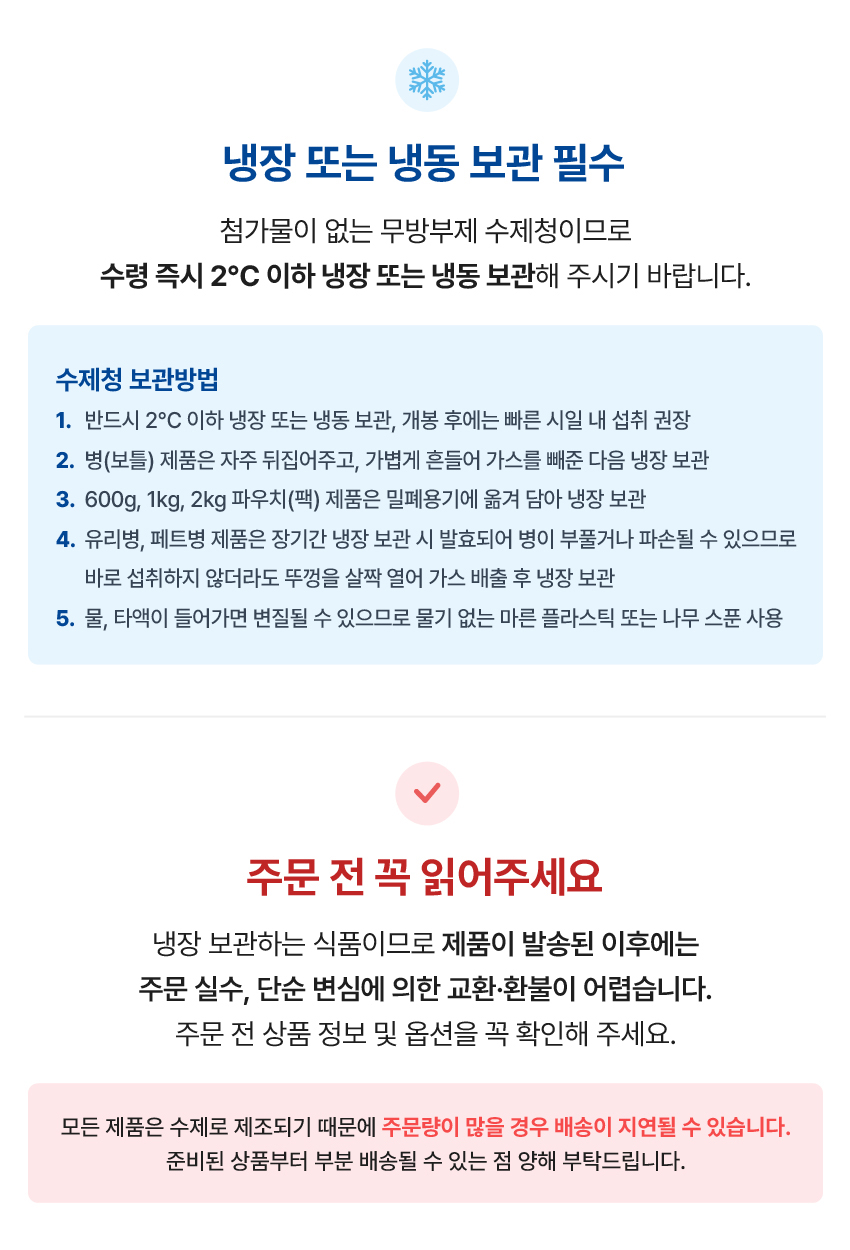 - 냉장/냉동 상품의 경우 출고 후 1-2 영업일 내 배송 예정이며, 상온 상품의 경우 택배사의 사정에 따라 출고 후 배송 시까지 1~3 영업일 소요될 수 있습니다.