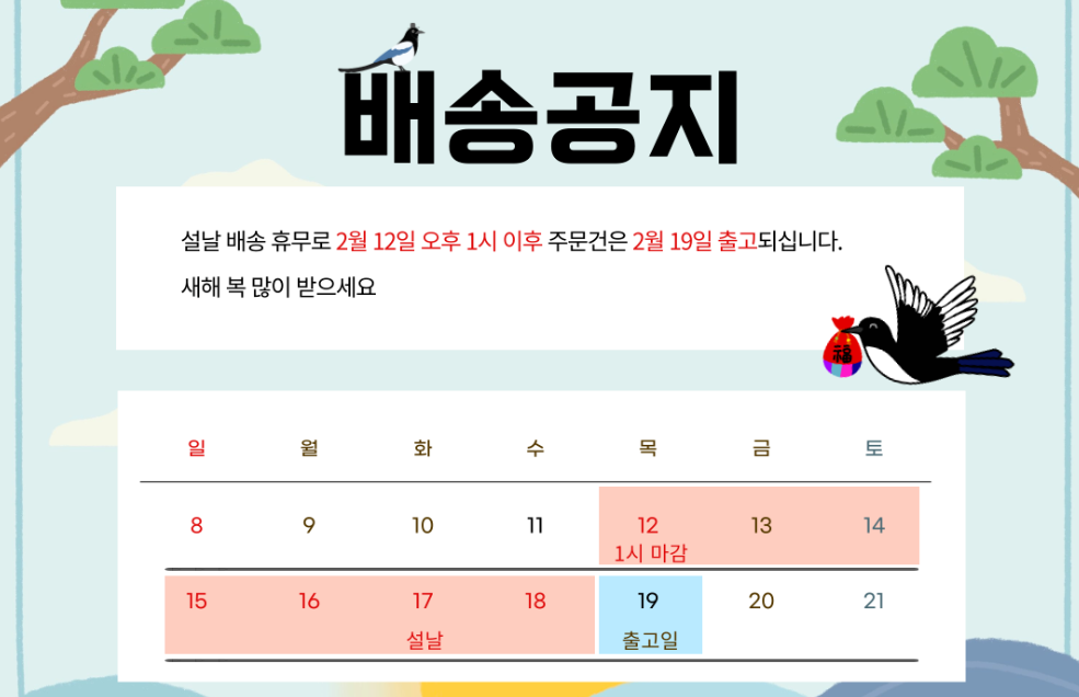· 공휴일 전날은 출고 불가하며 당일 출고건은 다음날 배송됩니다.