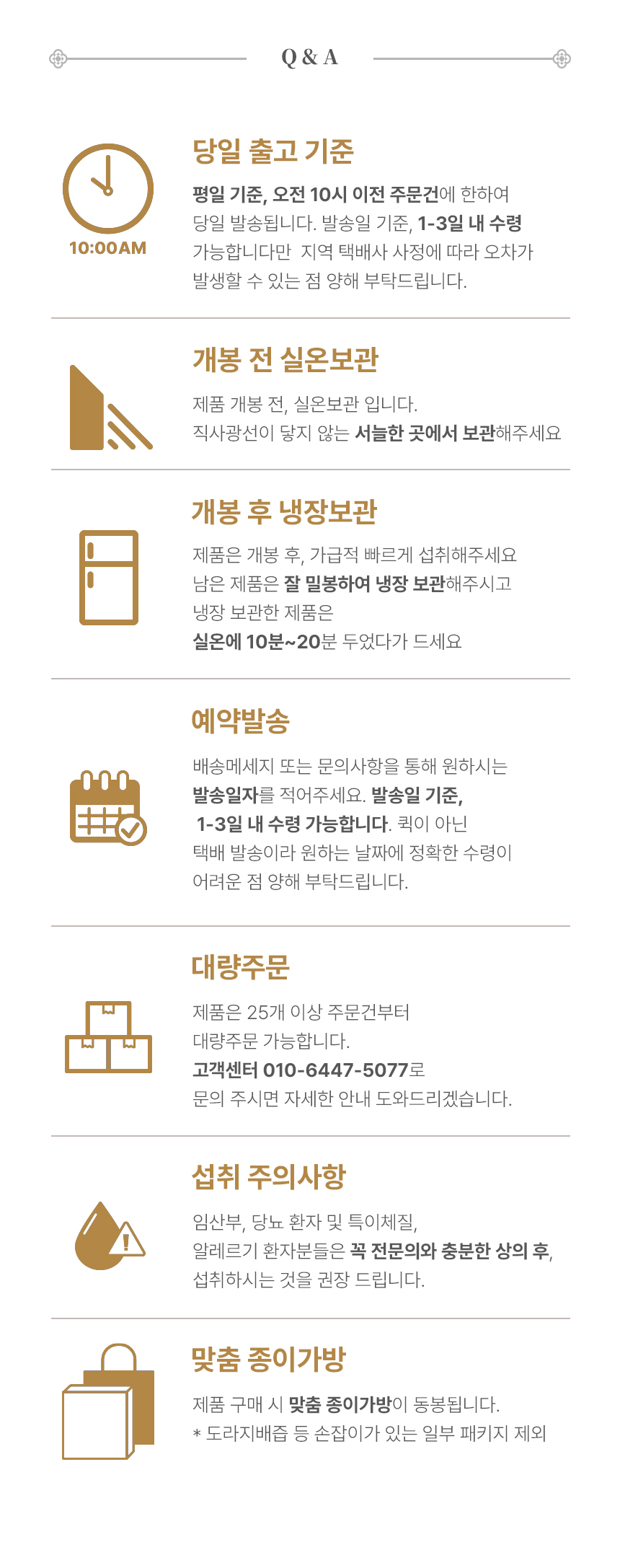 · 주의사항 - 일요일, 법정공휴일은 배송(도착)하지 않습니다. (명절 및 특수시즌 제외) - 배송지 정보와 받으시는 분의 장소 및 연락처가 불분명할 경우에는 배송이 지연될 수 있으며, 그로 인한 상품 변질에 대해서는 자연이랑이 책임지지 않습니다. |
