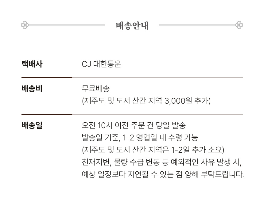 · 공휴일 전날은 출고 불가하며 당일 출고건은 다음날 배송됩니다.