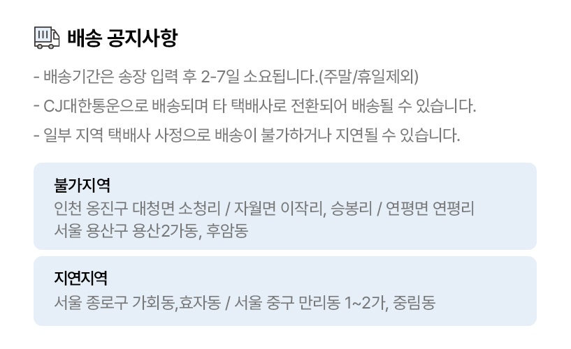 · 공휴일 전날은 출고 불가하며 당일 출고건은 다음날 배송됩니다.
