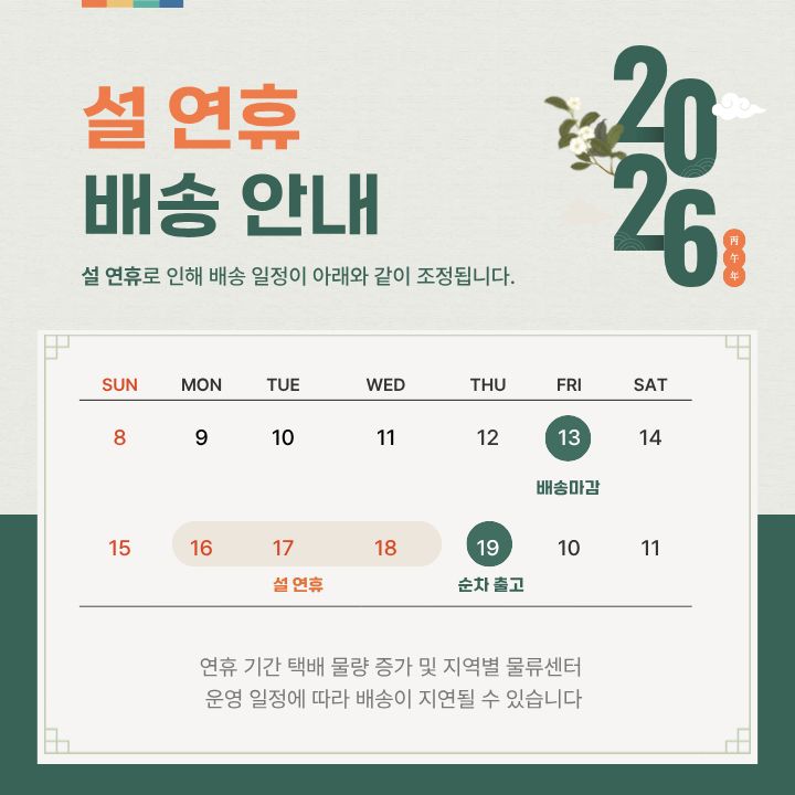· 공휴일 전날은 출고 불가하며 당일 출고건은 다음날 배송됩니다.