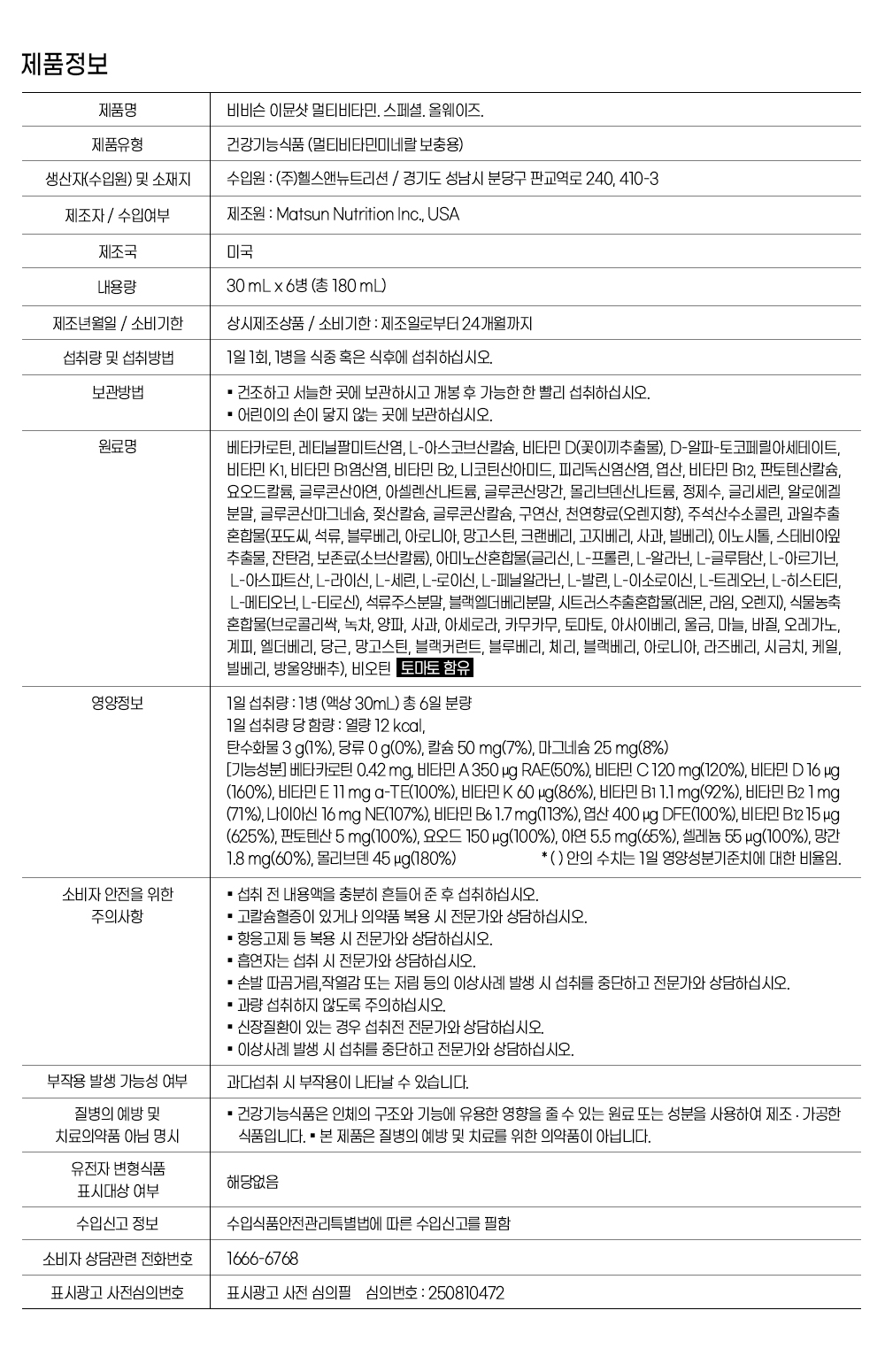 | 판매단위 | 180 mL(30mL x 6병) x 1박스 | |