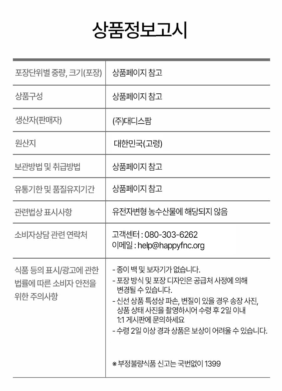 ![]() - 재고의 유무, 배송 지역, 택배사 사정에 따라 배송이 지연될 수 있습니다. - 냉장/냉동 상품의 경우 출고 후 1-2 영업일 내 배송 예정이며, 상온 상품의 경우 택배사의 사정에 따라 출고 후 배송 시까지 1~3 영업일 소요될 수 있습니다. |