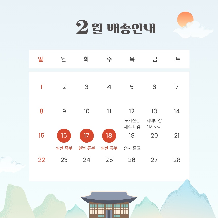 · 공휴일 전날은 출고 불가하며 당일 출고건은 다음날 배송됩니다.