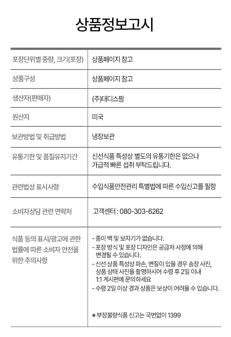![]() - 재고의 유무, 배송 지역, 택배사 사정에 따라 배송이 지연될 수 있습니다. - 냉장/냉동 상품의 경우 출고 후 1-2 영업일 내 배송 예정이며, 상온 상품의 경우 택배사의 사정에 따라 출고 후 배송 시까지 1~3 영업일 소요될 수 있습니다. |