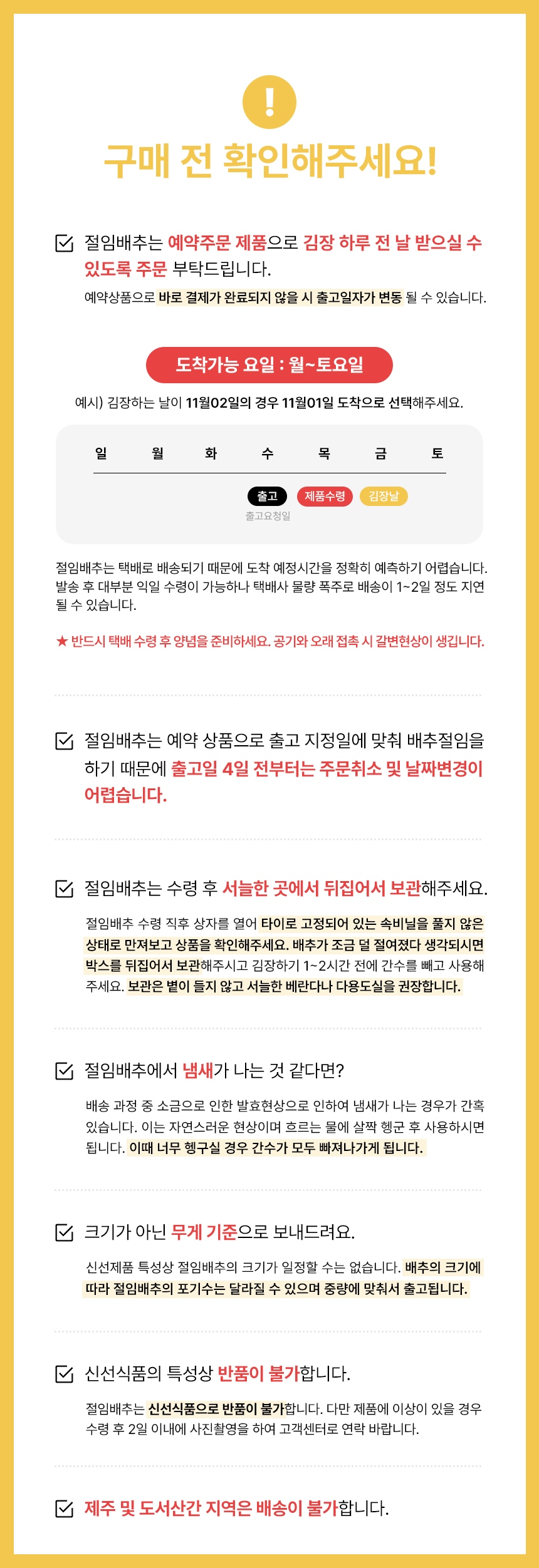 · 주의사항 - 일요일, 법정공휴일은 배송(도착)하지 않습니다. (명절 및 특수시즌 제외) - 배송지 정보와 받으시는 분의 장소 및 연락처가 불분명할 경우에는 배송이 지연될 수 있으며, 그로 인한 상품 변질에 대해서는 자연이랑이 책임지지 않습니다. |