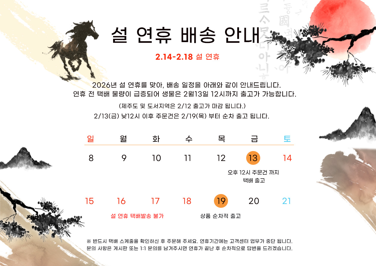 · 공휴일 전날은 출고 불가하며 당일 출고건은 다음날 배송됩니다.