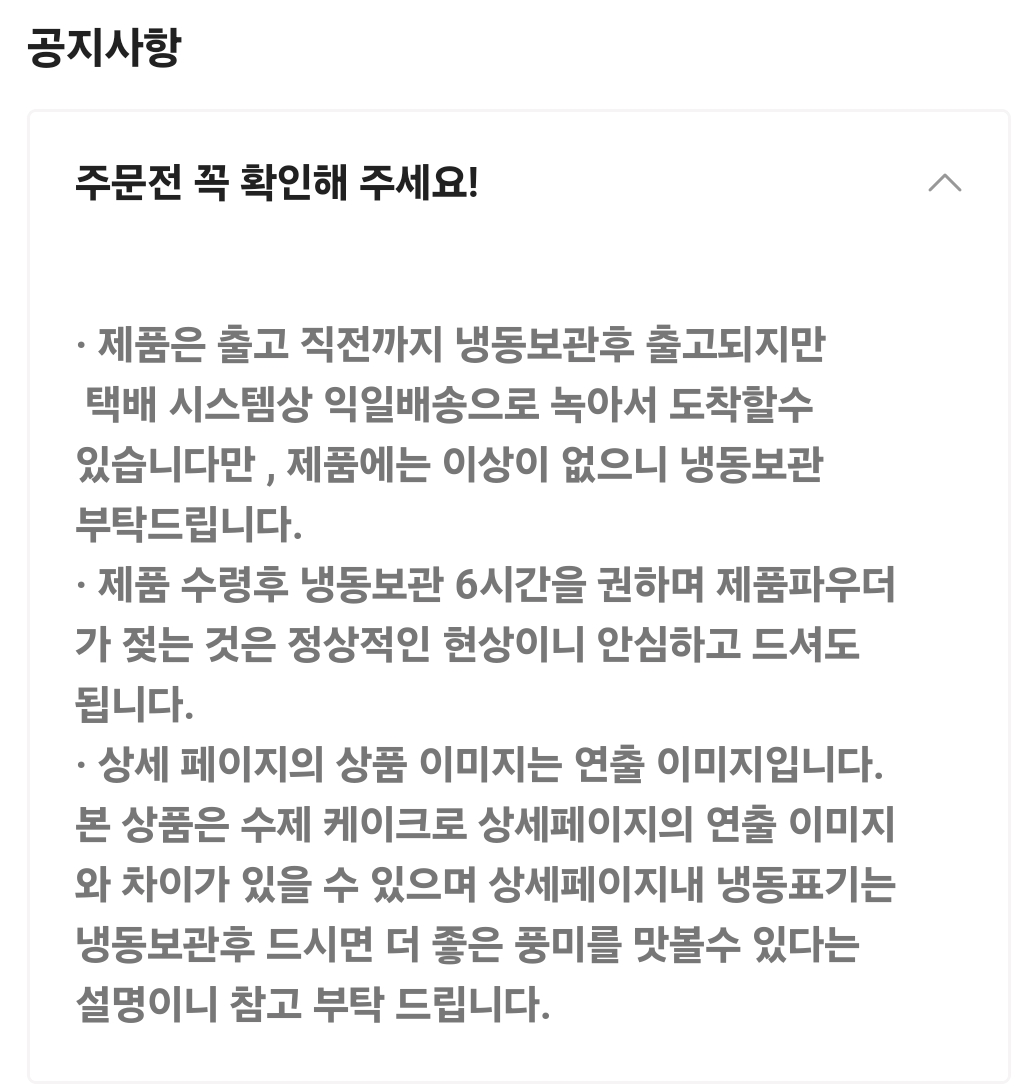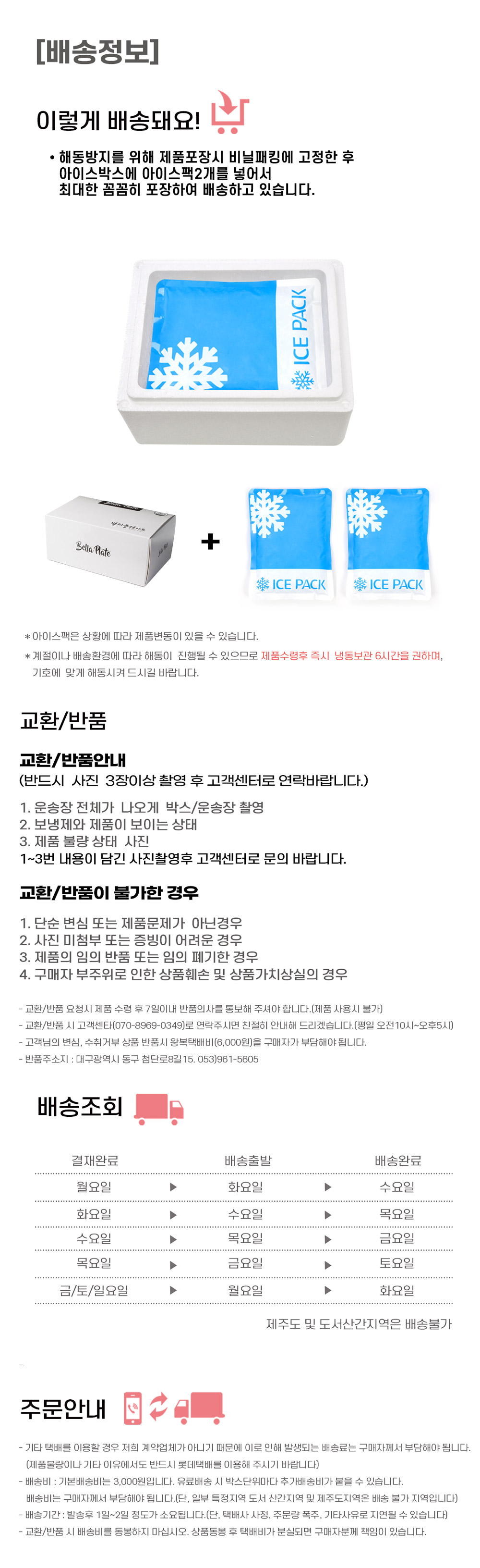 · 주의사항 - 일요일, 법정공휴일은 배송(도착)하지 않습니다. (명절 및 특수시즌 제외) - 배송지 정보와 받으시는 분의 장소 및 연락처가 불분명할 경우에는 배송이 지연될 수 있으며, 그로 인한 상품 변질에 대해서는 자연이랑이 책임지지 않습니다. |